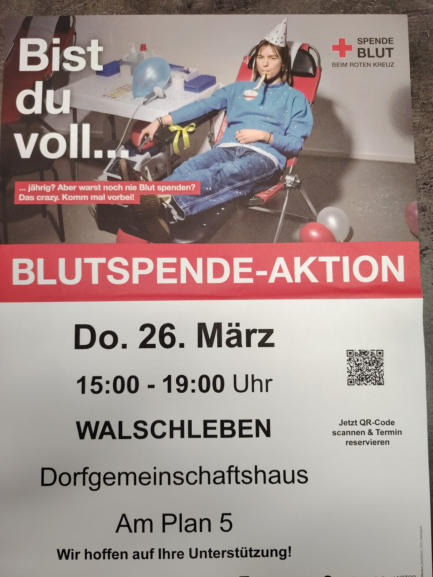 Am Donnerstag, 26. März findet im Dorfgemeinschaftshaus Am Plan 5 eine Blutspendeaktion statt, alle Interessierten sind von 15 bis 19 Uhr herzlich willkommen.