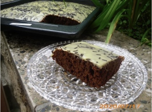 Oder ich nehme ein Blech 29x32cm und mache eine Ganache auf den ausgekühlten Kuchen.