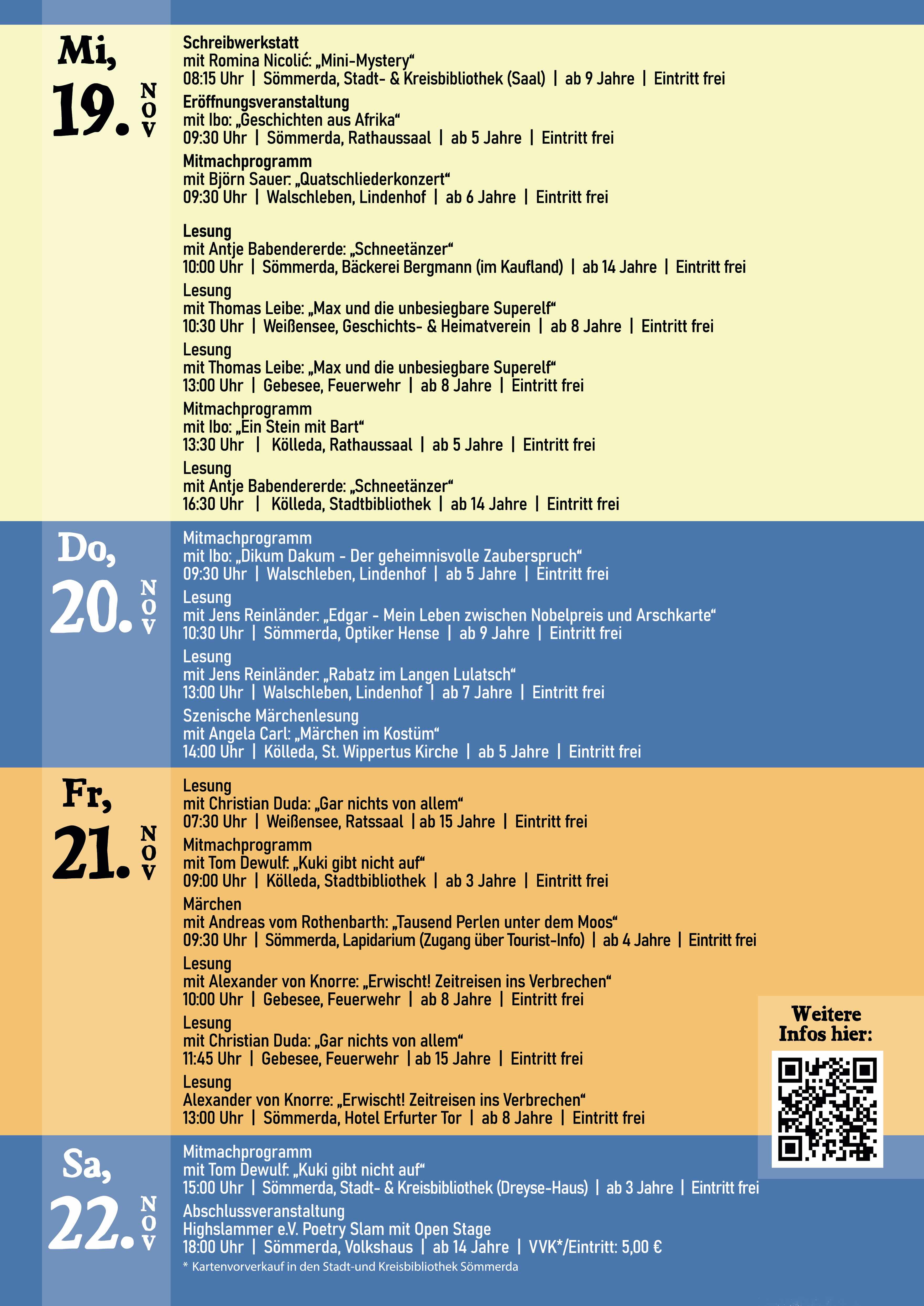 Vom 19. bis 22. November finden im Landkreis Sömmerda die 4. Kinder- und Jugendliteraturtage statt. Mit 28 Veranstaltungen, die größtenteils öffentlich und kostenfrei sind, wird ein abwechslungsreiches Programm für Kinder, Jugendliche und Familien des Landkreises Sömmerda zusammengestellt.