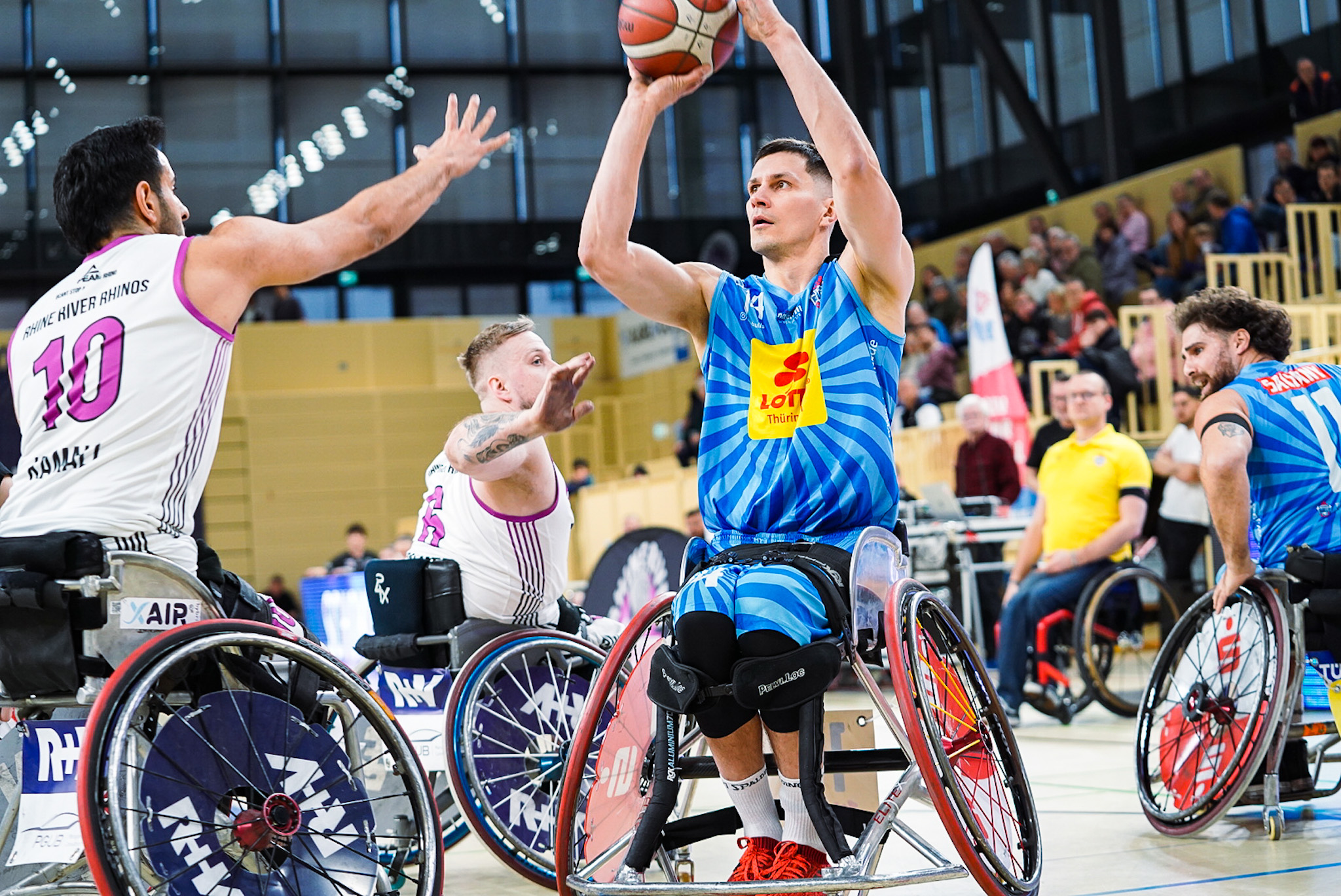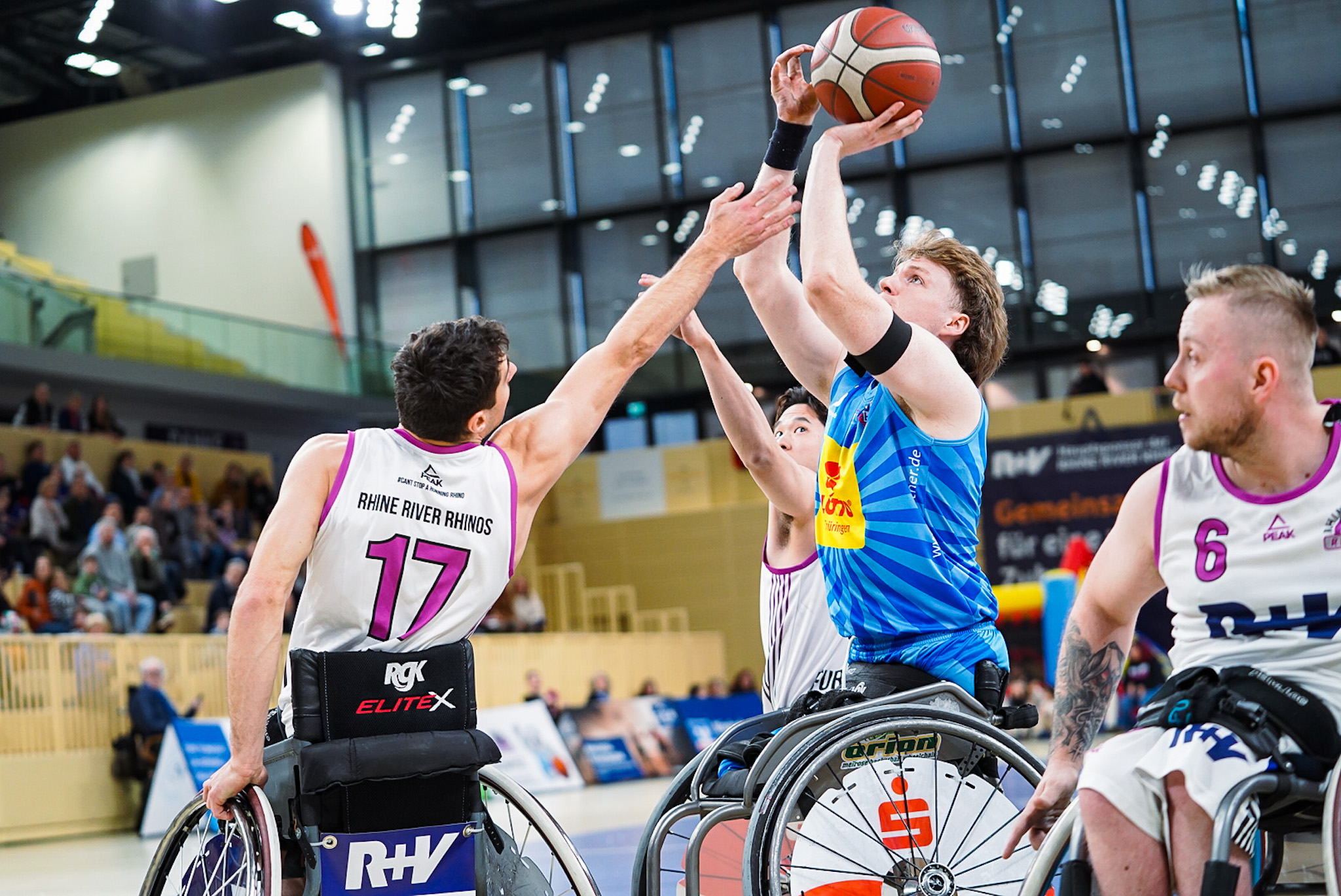 Der Start in den zweiten Abschnitt gehörte den Hausherren. Nach einem Buzzer von Dreimüller und einem Korbleger von Neuzugang Furusawa erspielten sie sich eine 18:13-Führung (13. Minute). Diese zwang Head Coach Bienek zur Auszeit, die Wirkung zeigte. Sein Team drehte die Partie und übernahm beim 19:18 (15. Minute) wieder die Führung. Es war kein Spiel für Feinschmecker, sondern für Liebhaber von robustem Rollstuhlbasketball. Die vielen zweiten Wurfchancen hielten die Rhinos im Spiel, die vor allem Mojtaba Kamali konsequent ausnutzte. Mit der Schlusssirene verkürzte er auf den Halbzeitstand von 25:23.
