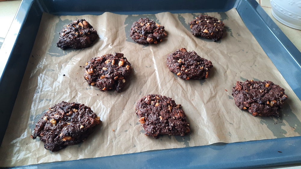 Backofen auf 180 Grad Ober- und Unterhitze vorheizen, Teig löffelweise auf ein belegtes Blech setzen und bei 180 Grad ca. 10-12 Min. backen.