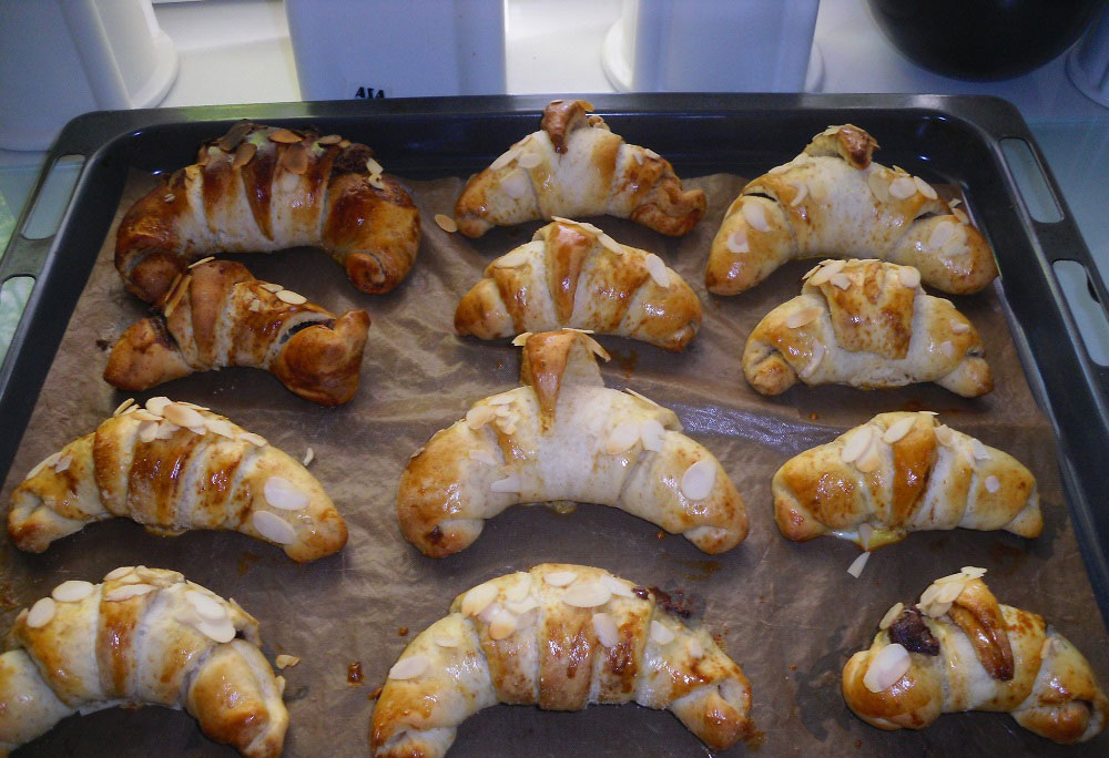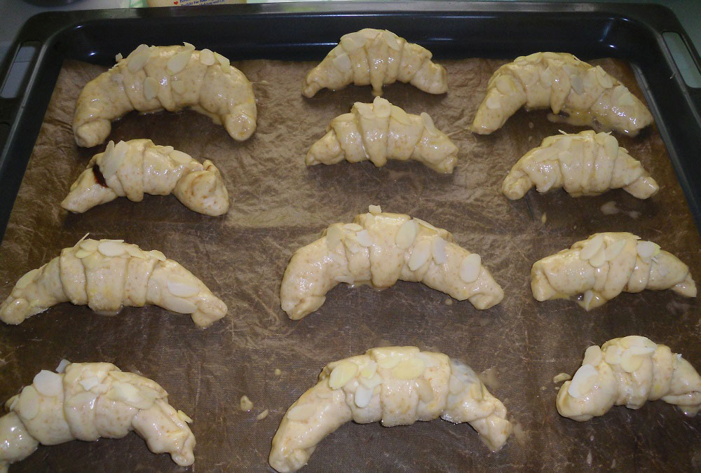 Nutella, bei Marzipan mit einem Ei cremig rühren, auf den oberen Teig je einen Klecks setzen, aufrollen dabei etwas lang ziehen und auf ein belegtes Blech legen, mit Ei/Milch besteichen und mit Mandelblättchen bestreuen, abdecken, 30 Minuten gehen lassen, backen bei 180 Grad ca, 12-15 Minuten, mit Puderzucker bestäuben.